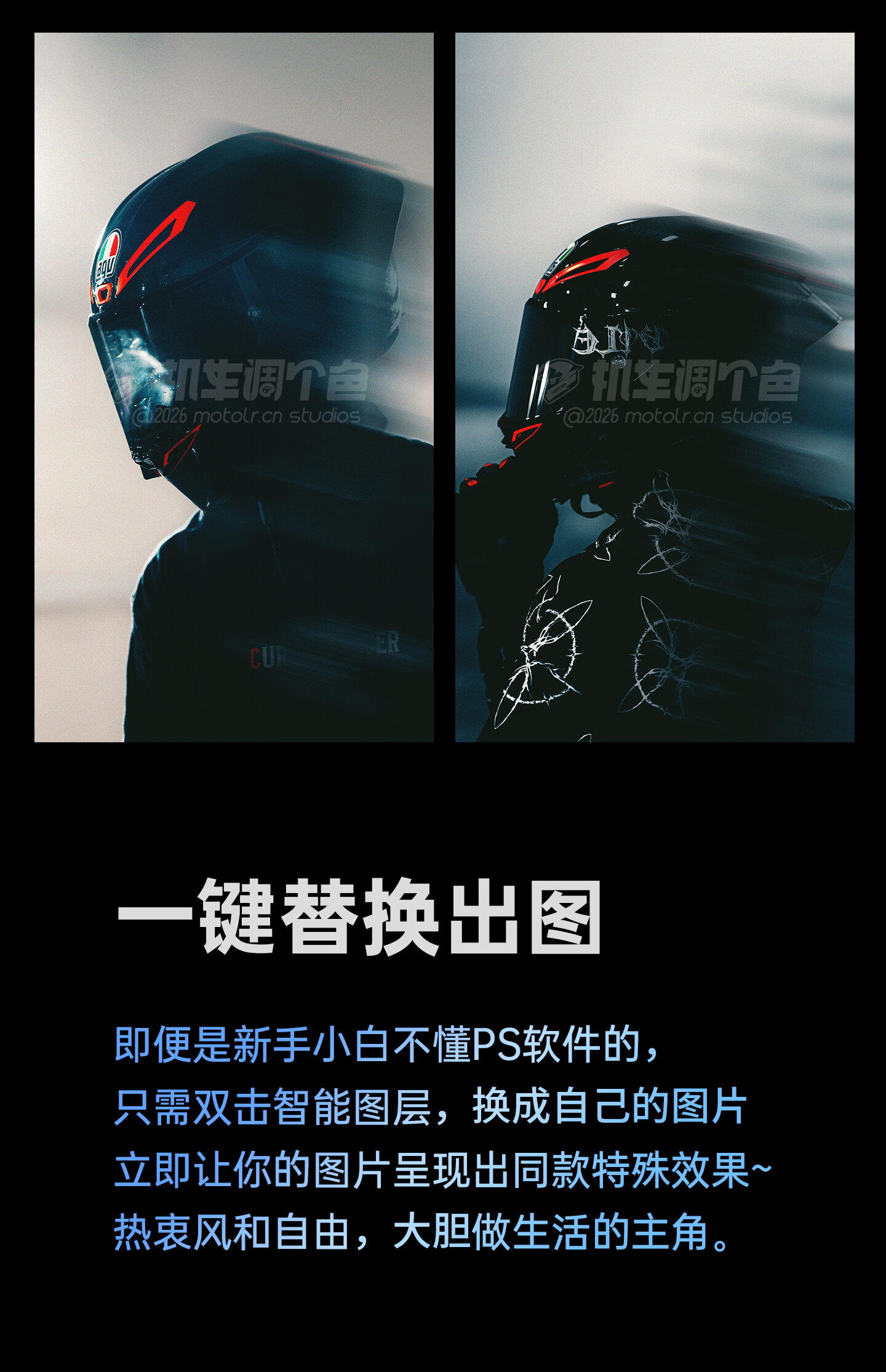 机车调个色 (MOTOLR.CN) 图片效果 电影感模糊拖影机车人像图片特效模板PSD格式 https://www.motolr.cn/design-assets/photo-effects/20244781.html